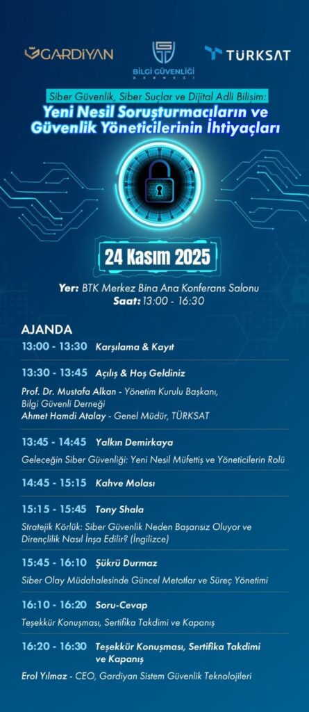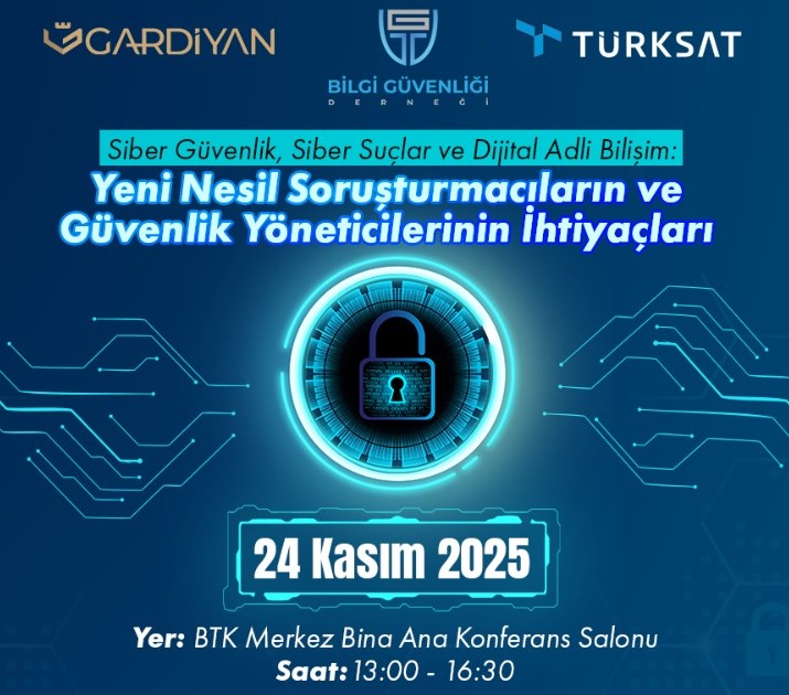 Bilgi Güvenliği Derneği, Türksat A.Ş. ve Gardiyan Sistem Güvenlik Teknolojileri A.Ş. iş birliği ile, 24 Kasım 2025 tarihinde BTK Merkez Bina Ana Konferans Salonunda “Siber Güvenlik, Siber Suçlar ve Dijital Adli Bilişim: Yeni Nesil Soruşturmacıların ve Güvenlik Yöneticilerinin İhtiyaçları” başlıklı bir etkinlik düzenleyecektir.