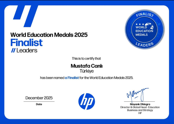 BGD Yönetim Kurulu Üyemiz ve MEB YEĞİTEK Genel Müdürü Mustafa Canlı, HP tarafından yürütülen 2025 World Education Medals’ta Leaders kategorisinde finale kalarak Türkiye’yi uluslararası arenada temsil etme başarısı göstermiştir.